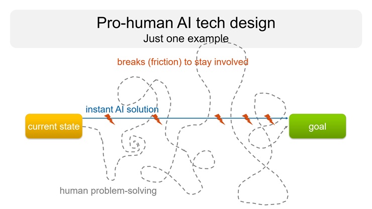 Humans rarely take the straight way to a desired goal (e.g., the production of a coherent, longer and non-trivial text as a solution to a task at work); and all the seemingly unnecessary detours and avoidable frictions in the process of creation are promised to be avoided (and essentially are abolished) by AI systems like ChatGPT that give the solution immediately. But upon closer inspection, this process of solution creation is very important for the human: for the quality of the final solution (e.g., we often find after deeper engagement with the subject matter that we were not asking the right question, not working at the actual problem at the beginning) as well as our human growth 13. The promised convenient solution suggested by the AI system will (1) not even be addressing the same problem as ours after engaging with the topic, let alone have the same quality (e.g., depth); and (2) we will not have matured to become the person our next task requires, but instead feel a little less enabled, self-effective, and autonomous. A pro-human AI designer recognizing this detrimental effect on person and outcome might design the interaction with said AI system in a way that would introduce certain breaks in the otherwise instant answer creation: Instead of providing a solution, the tool would guide the human through a few strategic questions and activations, aimed at invoking a thinking process in its user that would (i) lead to a better overall outcome than in the cases of human or AI system alone and (ii) do this in an efficient way that still leverages the speed of the tool. Such a pro-human AI system would be good not only for its user, but equally good for the business employing this user, and good for its vendor (as happy and successful customers are a great basis for success).